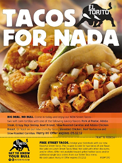 2 Free Street Tacos from El Torito 7 May, 2012 by KatBp Leave a Comment Head over HERE to print out a coupon for 2 free street tacos from El Torito. Offer expires 5/12/12