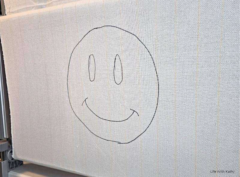 My daughter really wanted to try to make a smiley face, but personally, I don’t recommend doing this until you know what you’re doing. I recommend just practicing on the fabric at first. She had a hard time with this at first since we were both new to the whole tufting process. We ended up just doing straight lines and such to start practicing off with first. Trying to go around the curved lines was a bit difficult at first, which is why I’d say to start off with something simple, like a straight line until you get the hang of it.