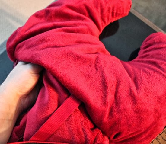 It is so simple, yet so genius how this works. All you have to do is turn it inside out and tuck all the excess inside into the shape of a neck pillow. It took just seconds for me to unzip, flip and stuff!