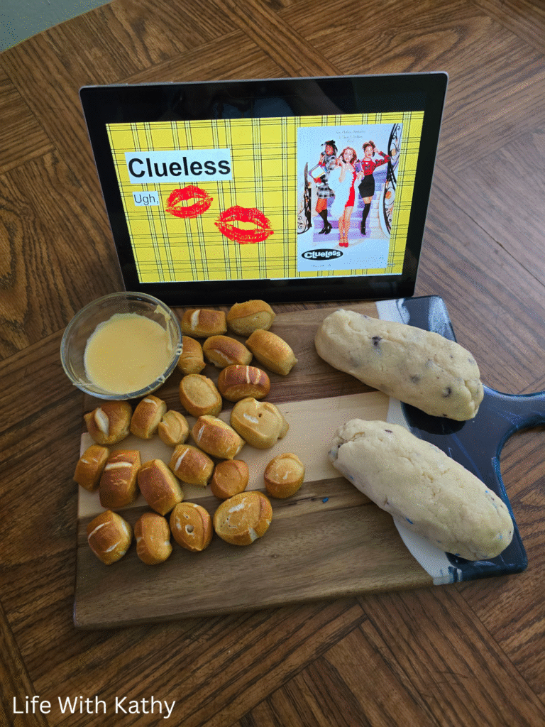 Clueless has always been one of my favorite movies. It’s one of those classic movies that you just love, at least for me it is. For this movie we decided to go with some edible cookie dough, and pretzel bites. The pretzels didn’t really have to do with the movie I don’t think, but the cookie dough sure did. There was a scene in the movie where Cher puts the whole thing of cookie dough on a pan and in the oven. This was something I always remembered from the movie, so we made some edible cookie dough for it.