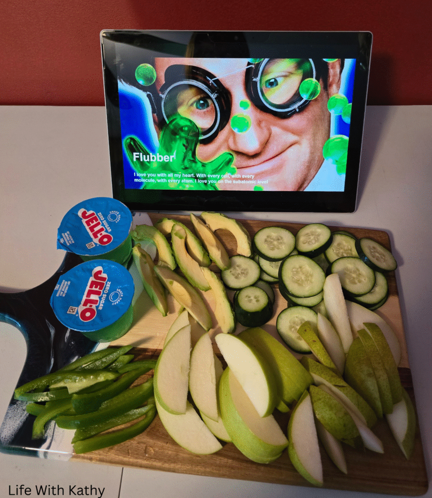 As you probably already know, Flubber is green. With him being green, we wanted to go with a green food theme for this movie. We even found some Jell-O so that it would look like Flubber. This is definitely a movie I was very excited to share with my daughters. I absolutely love Robin Williams and all of his movies. This was always a favorite of mine too. I thought my daughters may enjoy this one because of Flubber. He’s adorable!