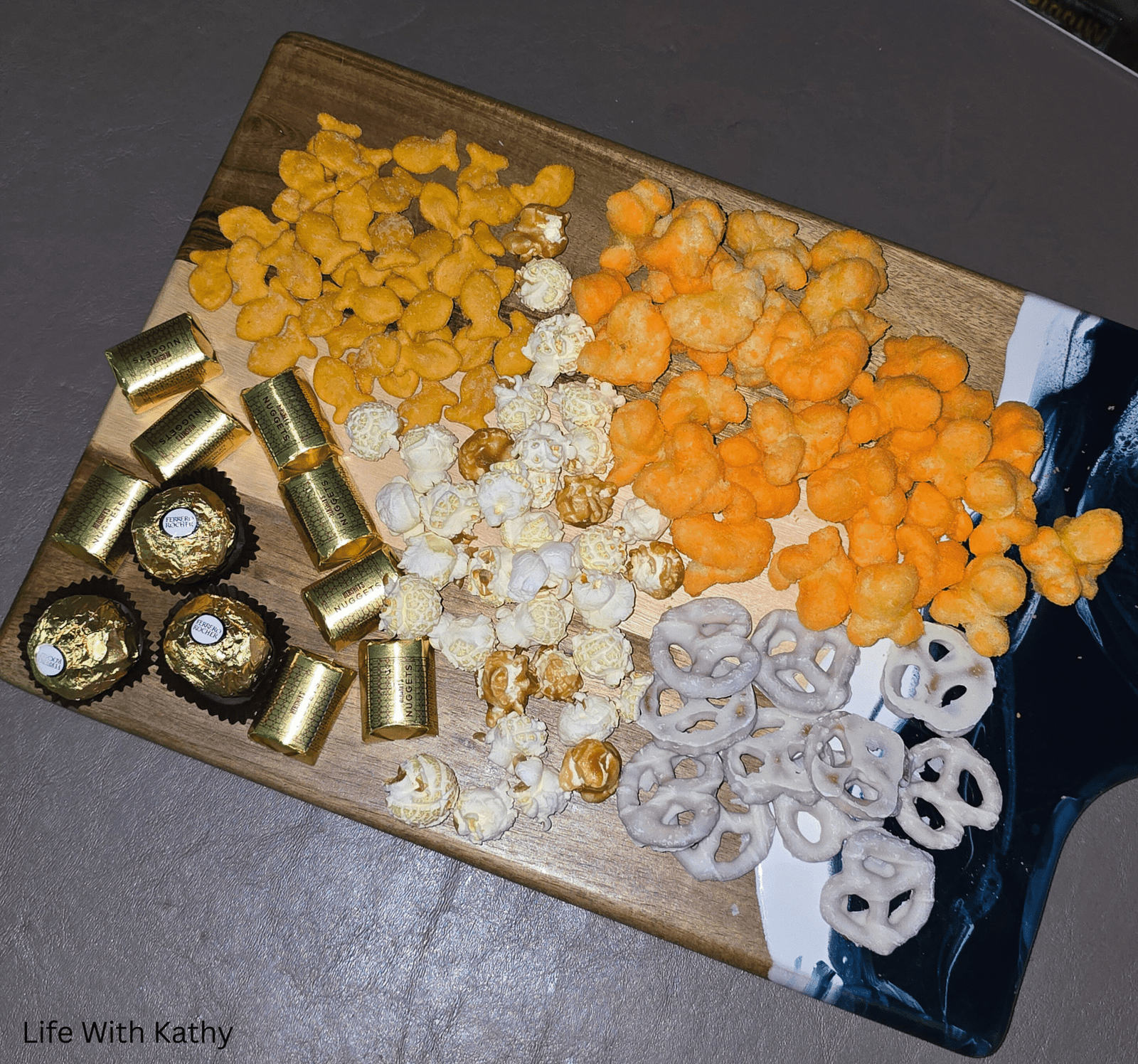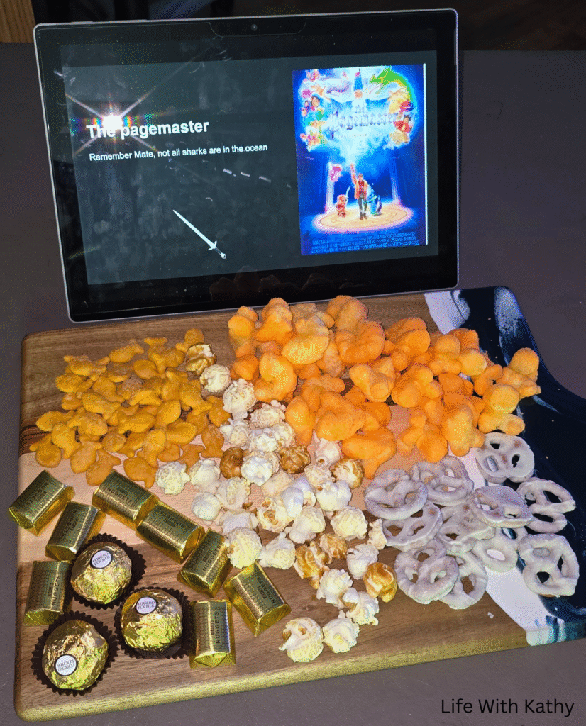 I always loved watching The Pagemaster when I was younger. I thought it was such a great movie with lots of magic. Because of all the magic and pirates and such in this movie, we decided to try to make the food theme more of a pirates treasure. We got some cold candies and then tried our best with the rest of the snacks.