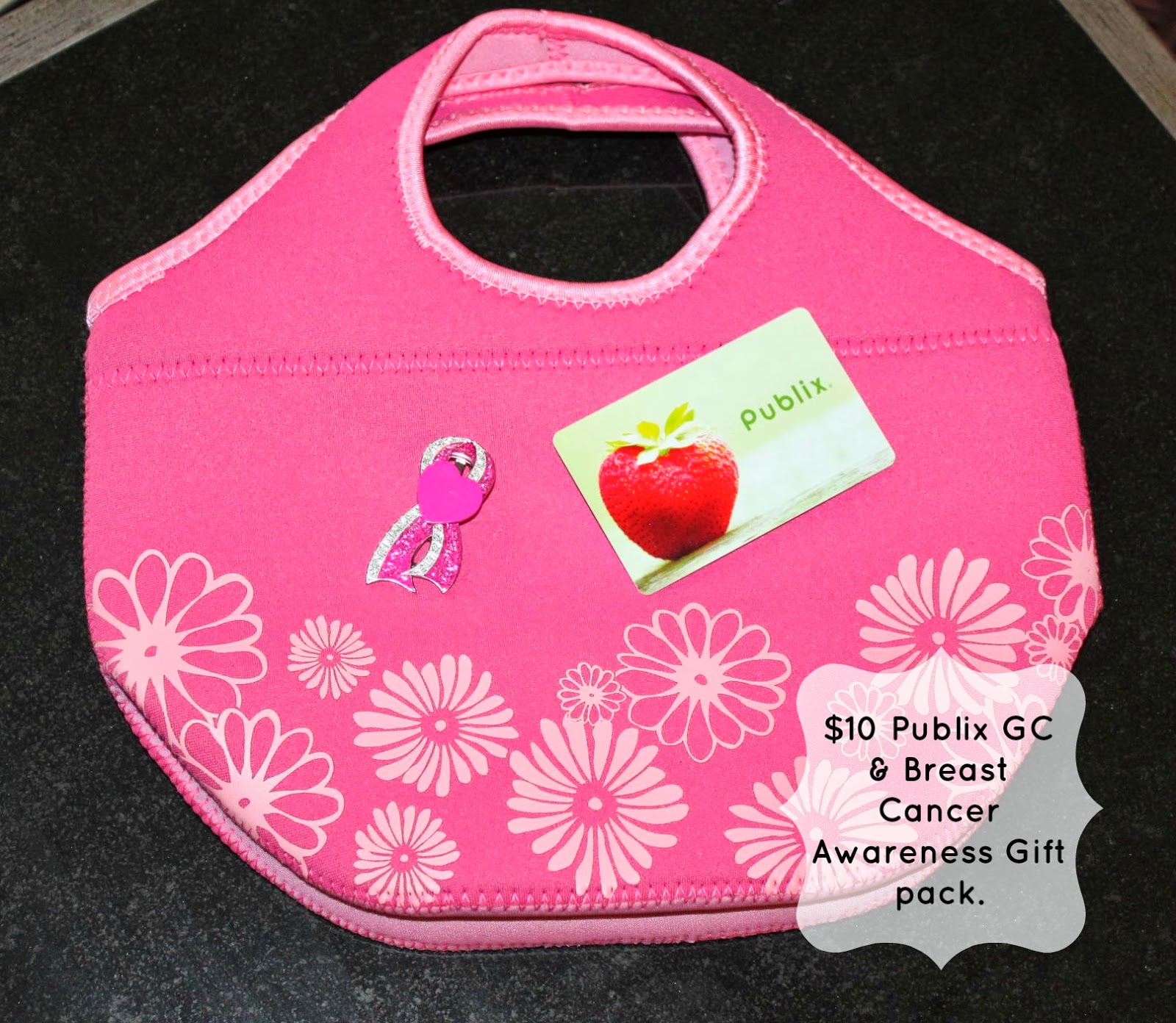 Today, I am excited to offer the chance for one of my readers to Win the gift pack pictured here. It includes: A $10 Gift Card to Publix, a sparkling breast cancer awareness pin, a heart magnet and a super cute pink flowered lunch tote!