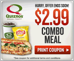 Quiznos – Coupon Good for a $2.99 Value Meal 24 May, 2012 by KatBp Leave a Comment Head over HERE to print out a coupon for a Quiznos meal for $2.99