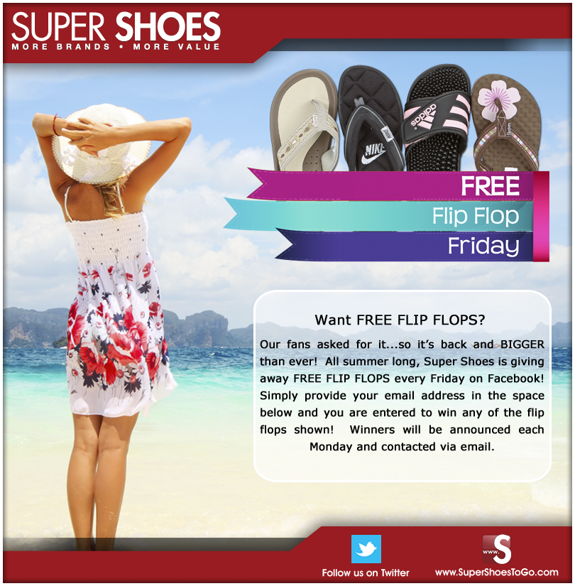 Super Shoes Free Flip Flop Friday 22 June, 2012 by KatBp Leave a Comment Head over HERE to enter to win free flip flops from Super Shoes